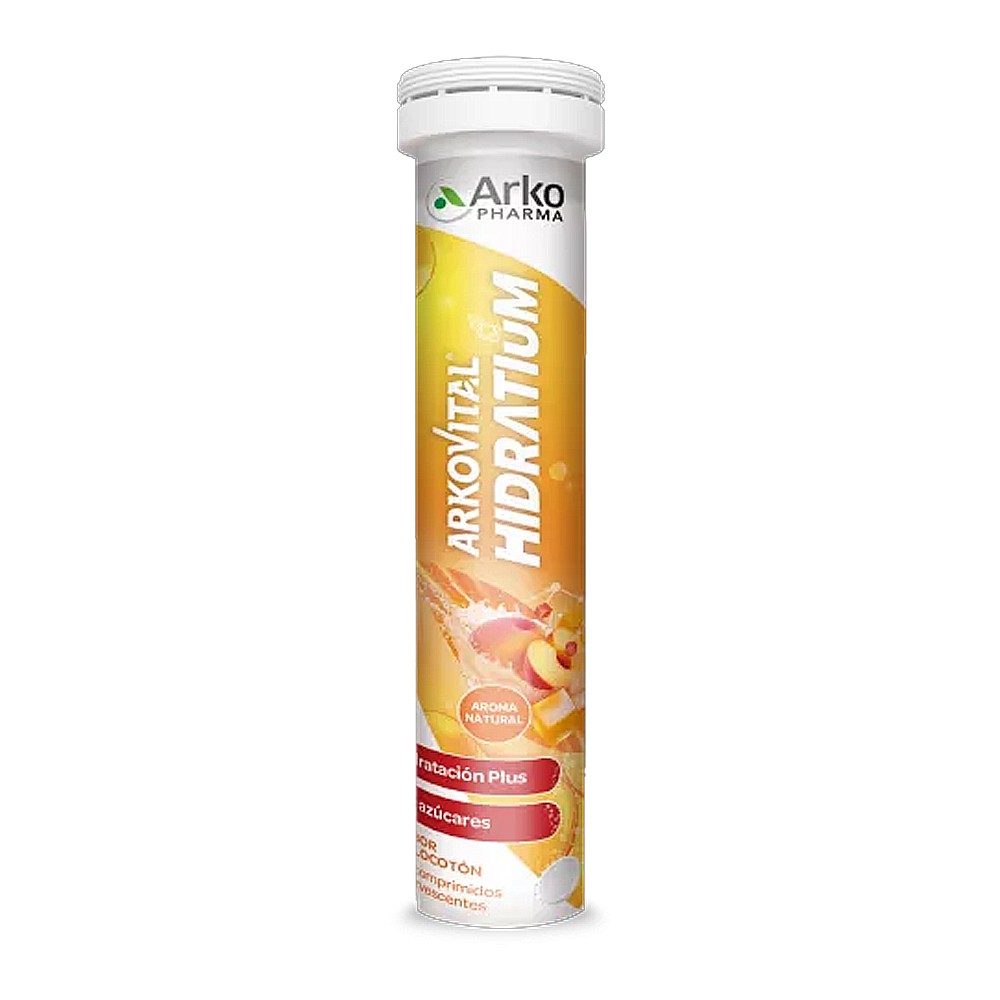 Arkovital Hidratium Hydration Plus Natural Peach Flavor 24 Effervescent Tablets is a food supplement based on electrolytes and vitamins formulated to promote proper hydration of the body. It is indicated in situations of fluid loss such as physical exercise, intense heat, or periods of increased activity.