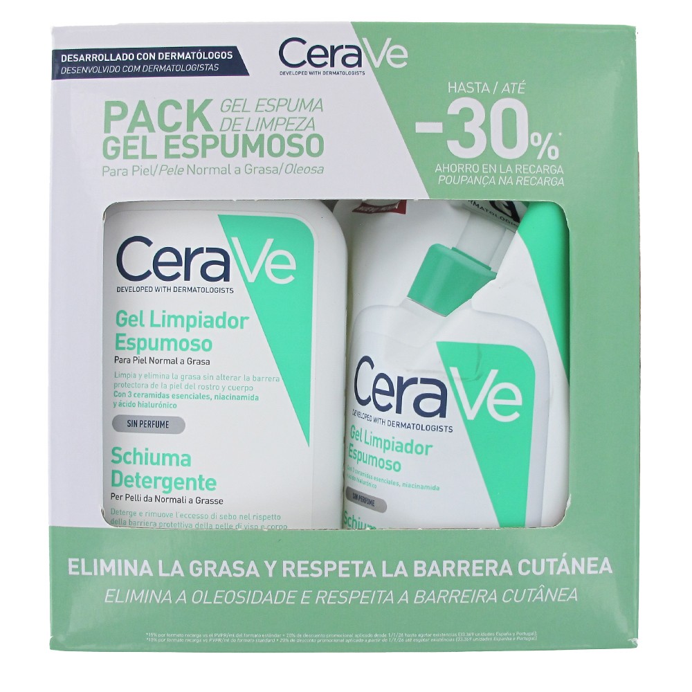 CeraVe Foaming Cleansing Gel 473ml + Refill 473ml is a value pack that includes the facial cleansing gel in a pump dispenser and a refill, specially formulated for normal to oily skin. It deeply cleanses, removing excess oil, impurities, and makeup residue without disrupting the skin's protective barrier.