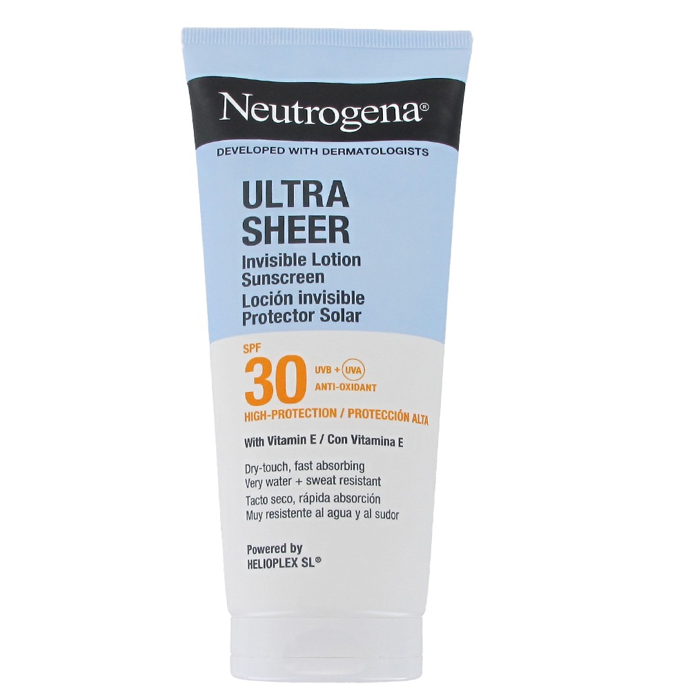 Neutrogena Ultra Sheer Invisible Lotion SPF 30 200ml is a body sunscreen lotion with high protection against UVA and UVB rays. It is formulated with vitamin E and offers an invisible, dry-touch finish, ideal for protecting skin from daily sun damage during outdoor activities, at the beach, or during sports.